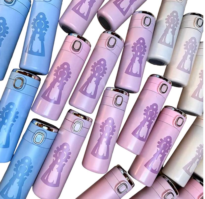 • Termo con indicador digital de temperatura. Capacidad: 400ml. Medidas 21×6.5cm. Elegir color: Marfil, Azul y Rosa.