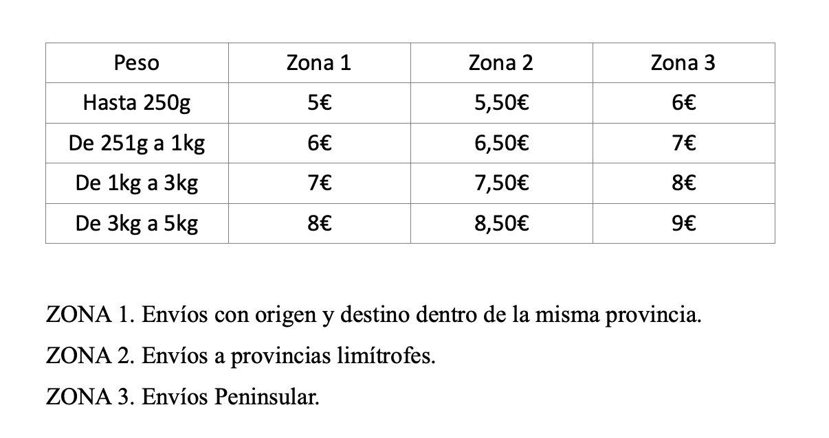 Todos los envíos serán realizados por la empresa de transportes Correos. El número de seguimiento se le facilitará al cliente.